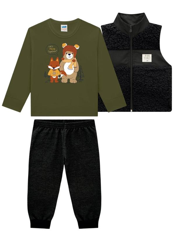 Composição: CAMISETA: COR: BG0026 100% Algodão COR: VD0416 50% Algodão 50% Poliéster CALÇA: 54% Algodão 46% Poliéster