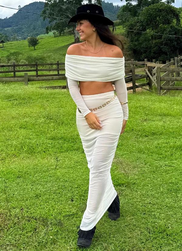 Choyee - Conjunto Cropped e Saia Hipermid em Tule Bege