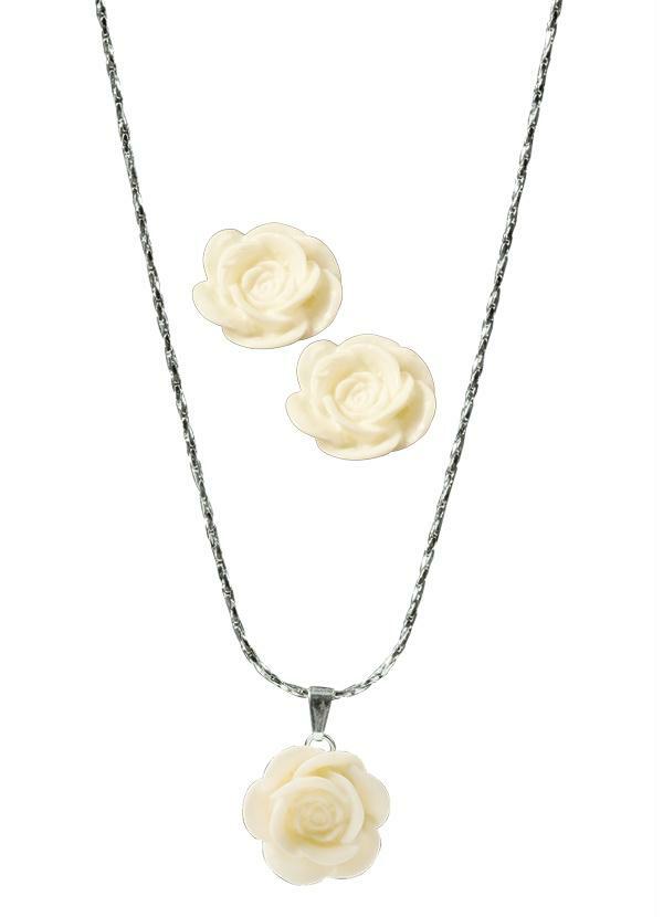 Conjunto Gargantilha e brincos Rosa Branca, desenvolvido em metal.