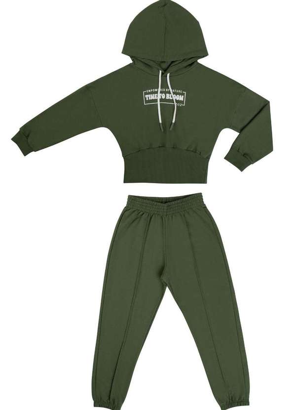 Conjunto Infantil Menina Verde com Moletom Cropped e Calça Jogger ¿ Have Fun Estilo e atitude para as pequenas fashionistas! O Conjunto Infantil da Have Fun é composto por um moletom cropped com capuz e uma calça jogger super estilosa, ambos em um moderno tom verde militar. Ideal para os dias mais fresquinhos, o conjunto oferece conforto e liberdade de movimentos sem abrir mão do visual descolado. O moletom possui estampa frontal "Time for School", barra ajustada e punhos canelados. A calça tem cós com elástico e modelagem soltinha com punhos, perfeita para acompanhar o ritmo das crianças com leveza e estilo.