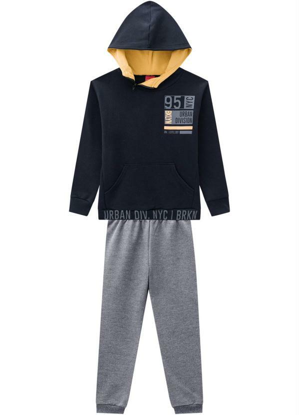 Observação: Casaco possui abertura em zíper diagonal no capuz, estampa na altura do peito e escrita na barra - Calça possui punhos em ribana e elástico confortável no cós