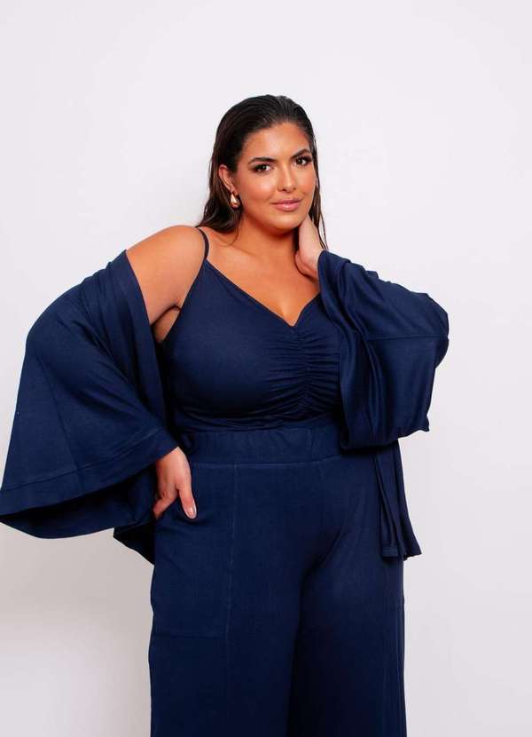 Ana Maya Curves - Conjunto Plus Size Calca Pantalona, Top e Kimono Azul