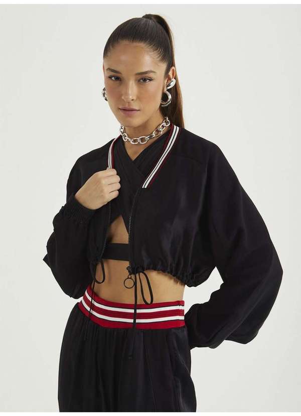 Modelagem: Ampla Modelo: Cropped Comprimento da manga: Longa Modelo da manga: Ampla Forro: Sim Decote: V Fechamento: Zíper Tecido: Nylon Composição: 100% Viscose Cor: Preto.