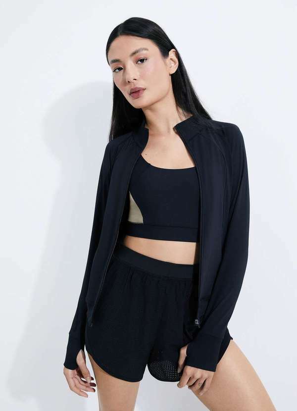 Jaqueta esportiva feminina de alta performance com tecido de toque gelado e macio, garante elasticidade e movimento na sua prática de exercícios. Detalhes da peça: Em malha Toque gelado Modelagem slim Bolsos laterais Fechamento em zíper de metal Abertura nos punhos para polegar