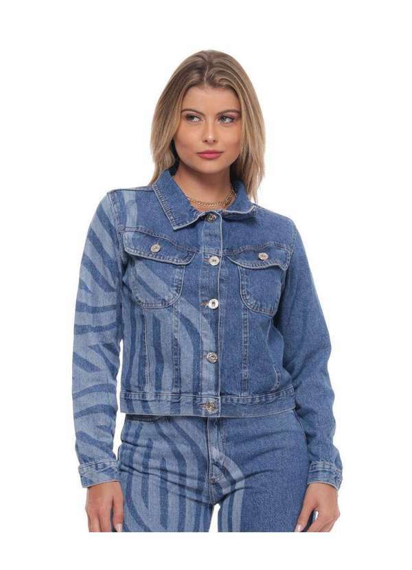 Jaqueta Feminina Jeans com Estampa Laser, recortes e bolso chapado funcional com lapela - Super Destroyed.