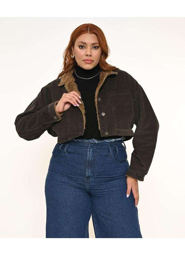 Razon Jeans - Jaqueta Feminina Veludo Cropped Plus Marrom C/Pelo - Marrom