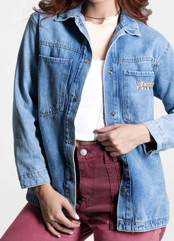 Jaqueta confeccionada em jeans. O modelo tem recortes frontais e aplicação no bolso frontal.Comprimento longoFechamento com botão metálicoBolsos frontais funcionaisBarra simplesModelagem: JaquetaTecido: JeansTipo de lavagem: AzulCor: Azul claro