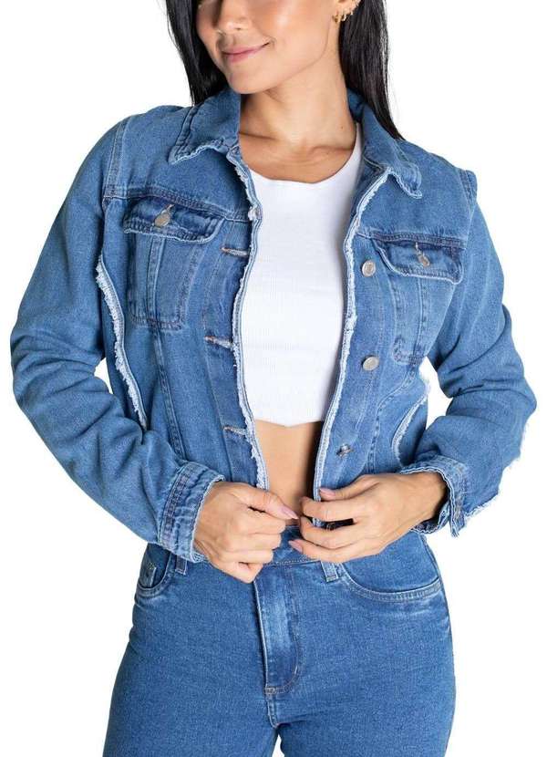 Jaqueta confeccionada em jeans. Modelagem cropped Comprimento cropped Fechamento com botão metálico Dois bolsos frontais funcionais. Barra diferenciada Modelagem: Jaqueta Tecido: Jeans Tipo de lavagem: Azul médio Cor: AzulComposição: 100% Algodão