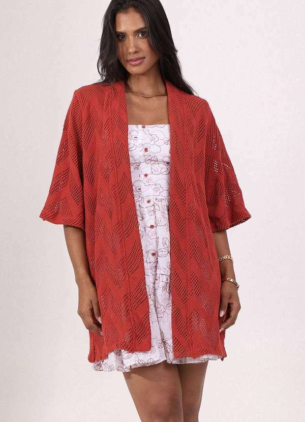Pequia - Kimono Tricot Curto Marrom Pequia Vermelho
