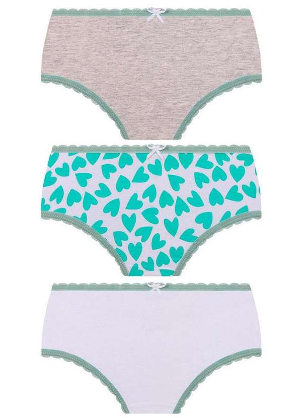 Características: Kit com 3 calcinhas infantil Confeccionada em algodão, leve, macia e extremamente confortável Cintura e cavas das pernas em elástico viés macio Fundo em algodão Aplicação de lacinho de cetim Composição: Na cor 8000 Cinza: 88% Algodão, 12% Poliéster Demais Cores: 100% Algodão