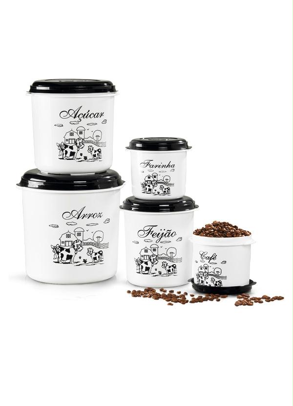 Contém: 1 pote Arroz 5.800ml, 1 pote Açúcar 3500ml, 1 pote Feijão 2200ml, 1 pote Café 1000ml e 1 pote Farinha 1000ml.