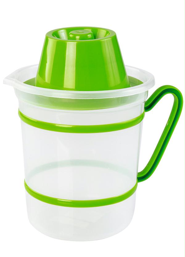Leiteira para micro-ondas, desenvolvida em plástico. Cor: Transparente com tampa verde. Capacidade: 1L.