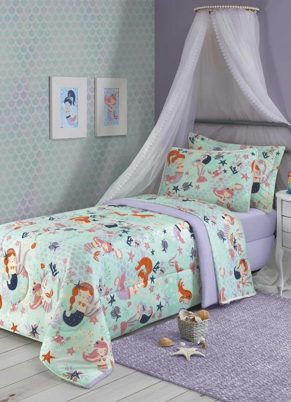 O lençol e a fronha possuem um toque macio e servem para colchões de até 30 cm de altura. O acabamento do lençol de baixo é com elástico, já a fronha é com estampa e possui acabamento em viés.