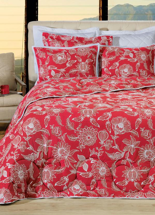 em algodão fio 30/1 penteado. Com 1 cobre leito (230x160 cm) e 1 porta travesseiro (70x50 cm).