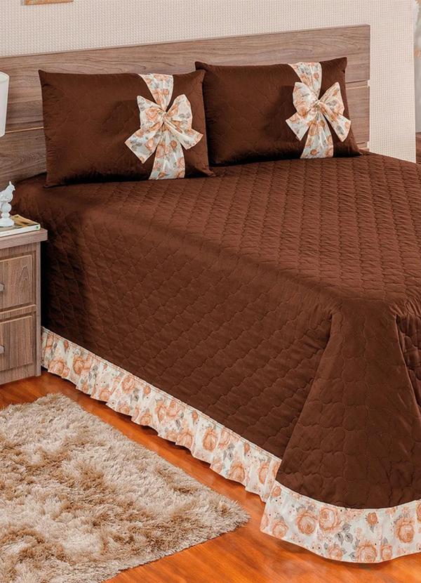 em poliéster. Com 1 cobre leito (270x260 cm) e 2 porta travesseiros com laço (70x50 cm cada).