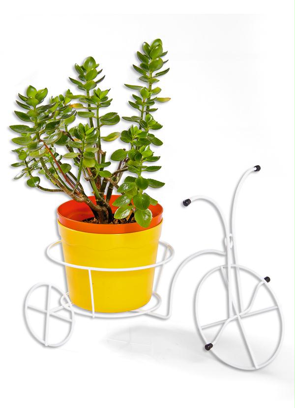 Suporte para vaso ou fruteira em forma de triciclo com cesto.