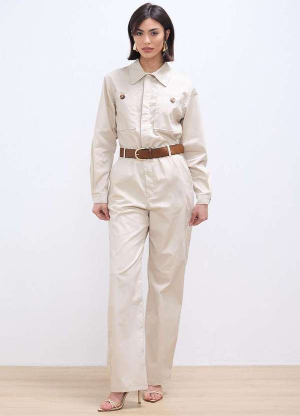 O macacão de sarja com maxi bolsos e cinto é uma peça-chave da temporada, unindo funcionalidade e estilo. Com inspiração no utilitarismo, ele traz praticidade para o dia a dia sem abrir mão da sofisticação. Ideal para compor looks versáteis, é tendência forte na moda feminina atual. A peça é confeccionada em tecido de algoção com elastano permitindo maior conforto ao vestir. Acompanha cinto de couro. Modelo veste P/36 Busto 84 Cintura 61 Quadril 90 Altura 1,74 Composição 97% algodão 3% elastano