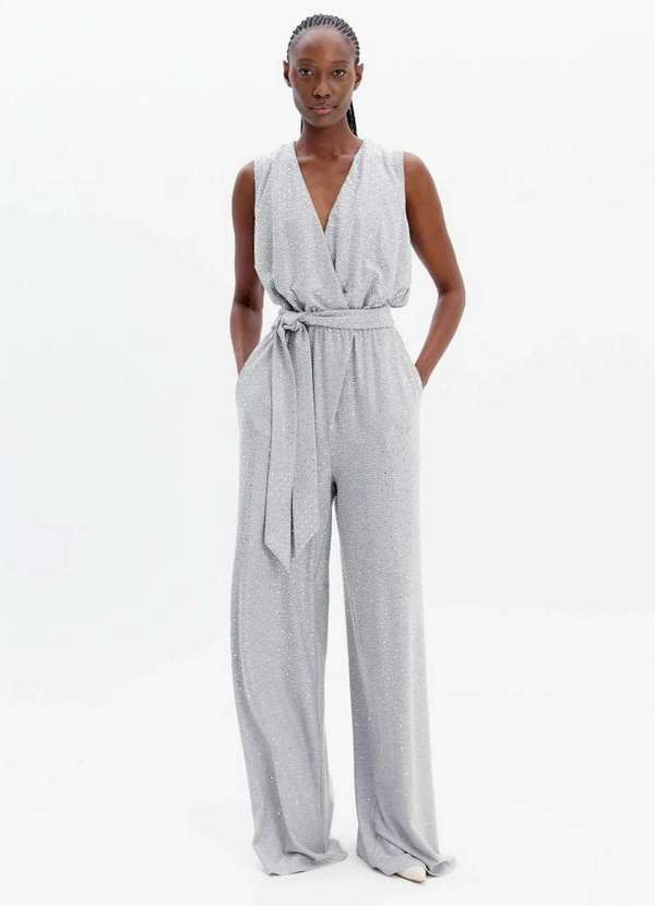 Confeccionado em malha cravejada de brilhos, este macacão longo traz elegância e glamour para qualquer ocasião especial. Com decote em v, modelagem transpassada, caimento fluido e faixa ajustável, é perfeito para quem quer se destacar.