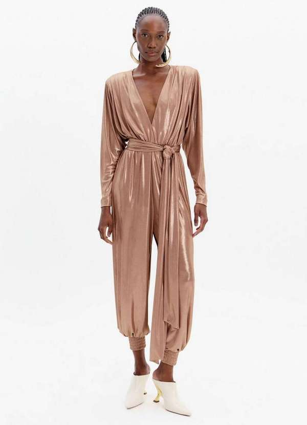 Autêntico, o macacão longo com decote em v apresenta mangas longas, barras elásticas e faixa ajustável. O brilho sofisticado da malha diferenciada se destaca, acrescentando glamour e modernidade às composições. Aposte!