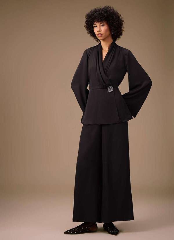 Maria.valentina - Macacão Maria.Valentina Solto Decote Transpassado Manga Longa Lon Preto