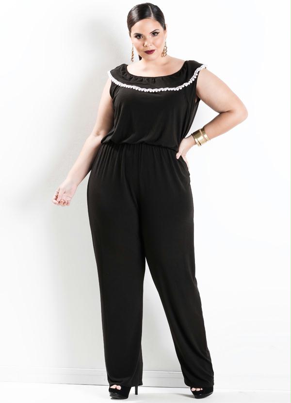 Marguerite - Macacão Ombro a Ombro com Babado Preto Plus Size