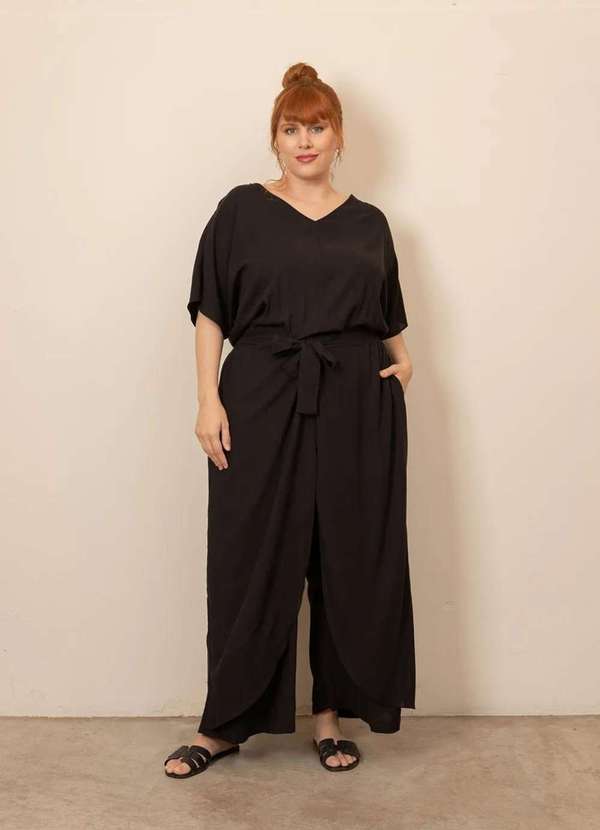 Macacão Plus Size em viscose. Modelagem ampla. Decote V e manga morcego. Elástico na cintura. Fechamento nas costas por zíper invisível e laço. Detalhe de amarração ajustável no estilo pareô. Bolsos nas laterais. Observação: Essa peça passou por processo de lavagem e não sofrerá encolhimento. Sugerimos lavar essa peça em água fria e à mão. Se optar pela máquina, use o modo delicado. Isso irá garantir bons resultados finais e uma maior durabilidade da sua peça. Não usar secadora. Não aceitamos devoluções de peças usadas. Medidas: G equivale 46-50 GG equivale 50-54 EXG equivale 54-58 Busto 120cm 128cm 136cm Cintura 90-120cm 98-128cm 106-136cm Quadril 140cm 148cm 156cm Comprimento 144cm 146cm 148cm