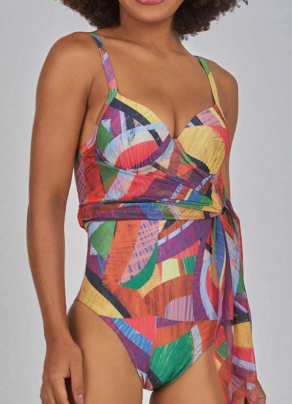 Características: Maiô saída estampado Modelo conta com tule se lycra super leve acoplado ao maiô que possibilita várias amarrações Bojos com profundidade adequada, ajusta-se perfeitamente aos seios Alças com regulagem e costas fechada de boa cobertura Frente compactada no abdômen Resistente de secagem rápida Cavas com elástico embutido, resistente oferecendo segurança nos movimentos Forro especial fino em microfibra, macio e confortável Tecnologia Zero Barriga,tecido exclusivo de textura compactada,ajuda a modelar o corpo Lycra XTRA LIFE,resiste 10 vezes mais ao cloro que elastanos comuns sem esse tratamento, além de ser mais resistente também a óleos bronzeadores e protetores solares Tecido com proteção UV50+, alta tecnologia em absorção dos raios ultravioleta,capaz de bloquear 98% dos raios UV Tecido consolidado de ótima estabilidade dimensional, não deforma, textura brilhante e vibrante Outros Detalhes: Vista por baixo Composição: Maiô:86% Poliamida, 14% Elastano Tule: 90% Poliéster, 10% Elastano