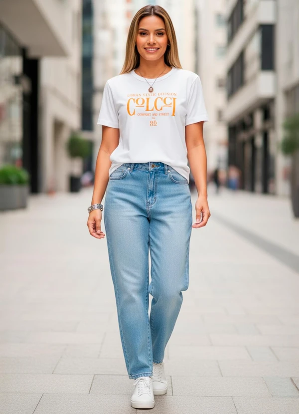 Camiseta em malha penteada de algodão com estampa frontal. Modelagem reta, gola redonda e mangas curtas. Confortável e moderna, ideal para compor looks casuais cheios de atitude.