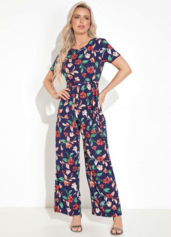 Moda Pop - Macacão Floral Marinho com Gota e Amarração