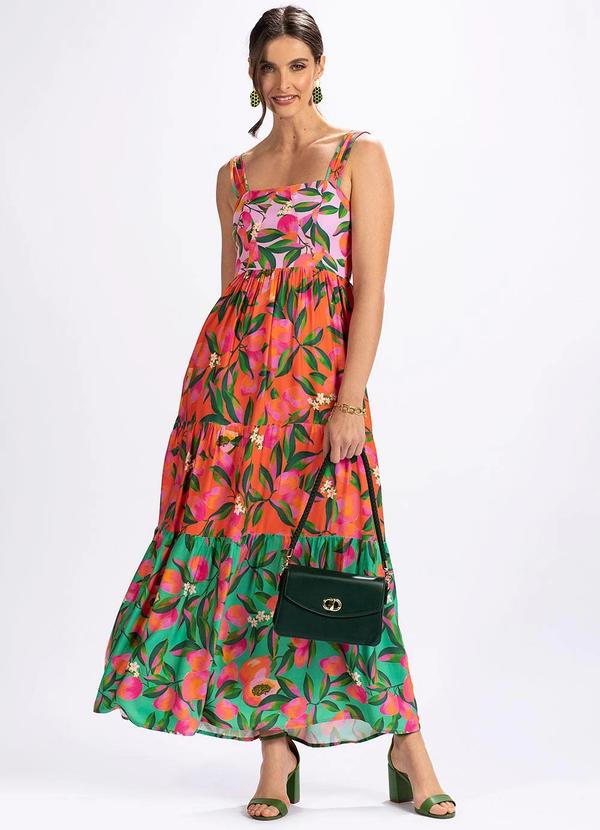 Vestido longo em viscose estampado, logomania, modelo evasê, decote quadrado, alças mais largas, busto duplo, decote costas com lastex, babado na barra.