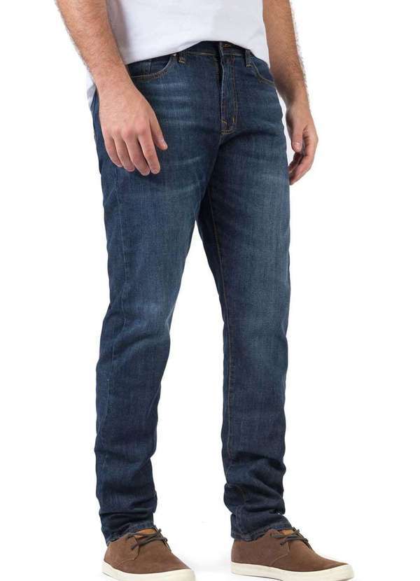 Calça confeccionada em jeans. Modelagem justa, cós levamente baixo, estrutura reta nas pernas com caimento levemente ajustado nas barras. Possui cós com passantes para cinto e fechamento por botão e zíper. Lavagem e acabamentos especiais. Peça indispensável para momentos casuais.