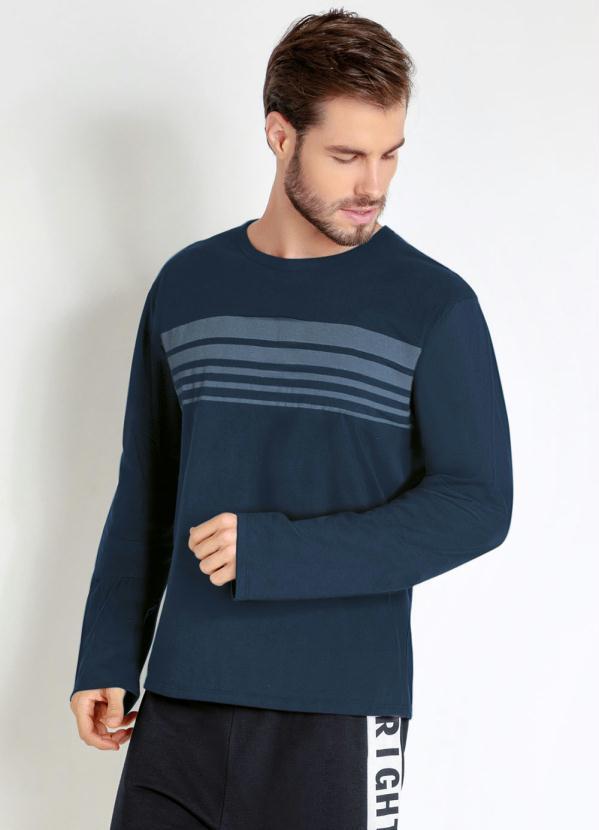 Outlet - Camiseta Manga Longa Azul e Estampa Localizada