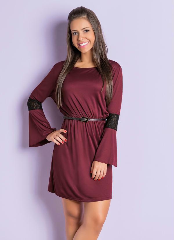 Outlet - Vestido Juvenil Bordô Manga Sino com Renda