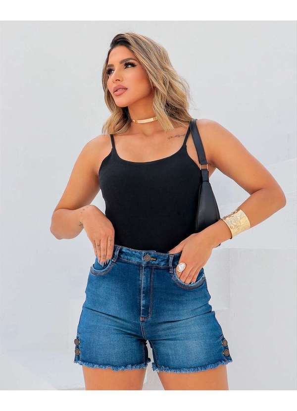 Consciência - Bermuda Jeans Feminina Cintura Alta com Botoes na Lateral Azul