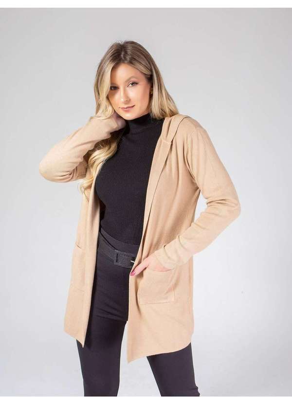 Cardigan em poliamida com viscose toque super macio, possui capuz que traz um estilo a peça, manga longa, comprimento médio, bolsos frontais, uma peça estilosa que não pode faltar no seu guarda-roupa.