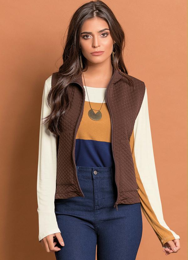 Muito estiloso, esse colete tem superfície matelassê que deixa o look mais moderno. Crie combinações diferentes com ele escolhendo blusas de manga longa ou com cores variadas. Você pode combiná-lo também com peças únicas, como macacão e vestidos, a produção fica bem jovial. Essa peça é ideal para ser usada na meia-estação e dar um toque original para seus looks.