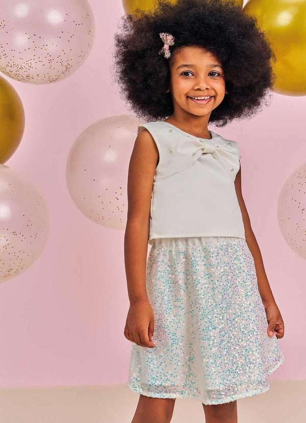 Kukiê - Conjunto de Blusa Boxy em Super Cetim e Saia em Paetê Kukiê Branco