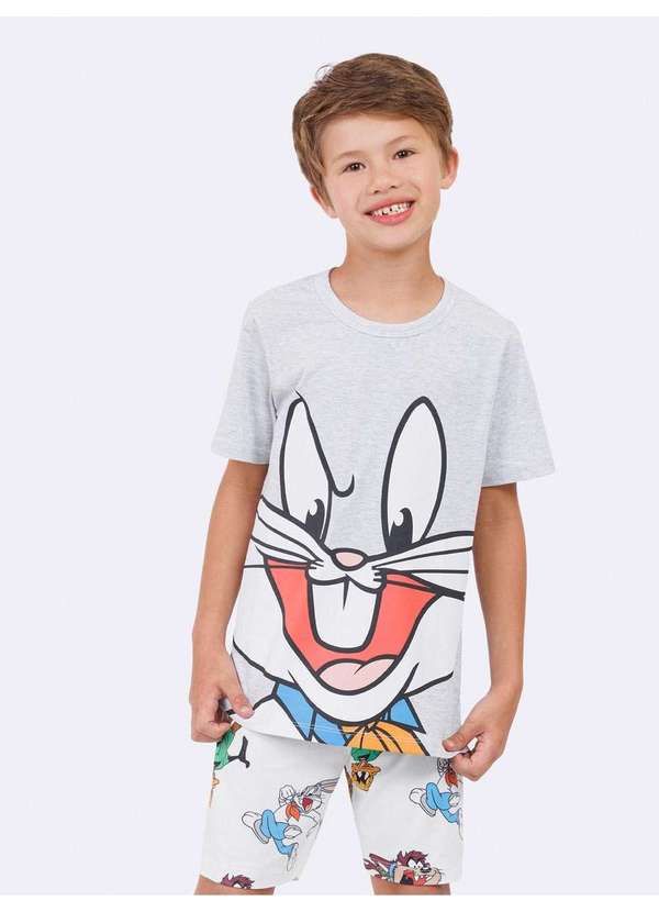 O Pijama Manga Curta Infantil Masculino Pernalonga da Veggi é uma opção confortável e divertida para o guarda-roupa noturno dos pequenos. A blusa de manga curta, confeccionada em malha mescla, apresenta um cinza suave que serve de fundo para a estampa vibrante do rosto do icônico personagem Pernalonga, destacando-se com seu sorriso travesso e orelhas pontudas. Complementando o conjunto, a bermuda em malha perfect touch exibe uma variedade de cenas animadas com Pernalonga e outros personagens clássicos da Looney Tunes em cores vivas sobre um fundo branco, proporcionando não apenas estilo mas também uma textura macia ao toque. Este pijama é perfeito para garantir noites alegres e cheias de conforto para as crianças.