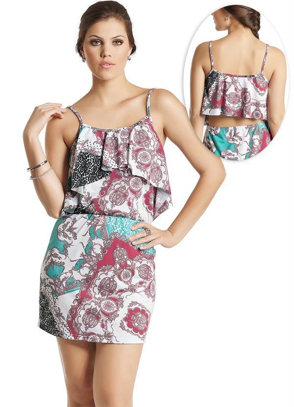 Vestido com estampa de lenço e abertura nas costas, confeccionado em poliviscose.
