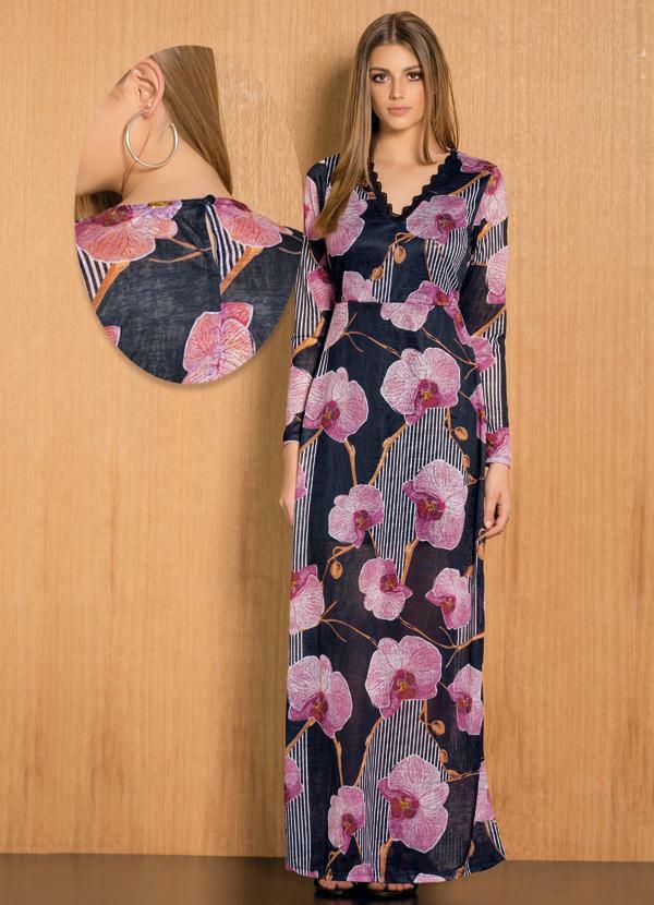 Vestidos longos são essenciais no guarda-roupas feminino, isso porque essa peça é extremamente fácil de combinar, deixa o look confortável e elegante ao mesmo tempo! Esse modelo ainda conta com uma linda estampa e tem detalhe de fenda na parte de trás da saia, que deixam a peça ainda mais interessante. A modelagem é fluída, por isso aposte num cinto delicado para evidenciar a silhueta.