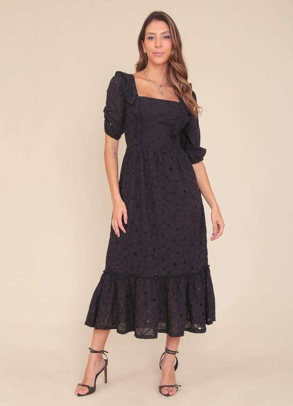 Pop Me - Vestido Midi Laise com Babado na Manga 3/4 Preto