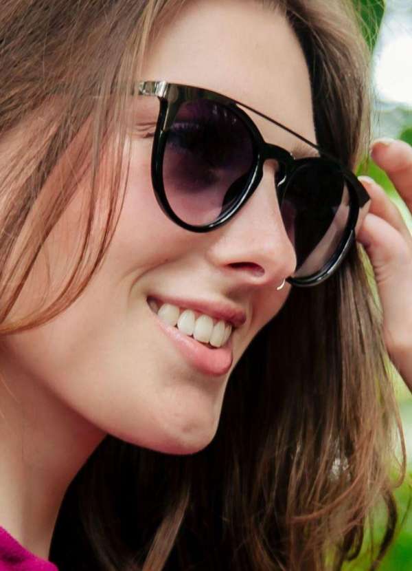 Óculos de sol em metal e lentes UV roxa feminino.Detalhes em prateado dão um toque moderno a peça.