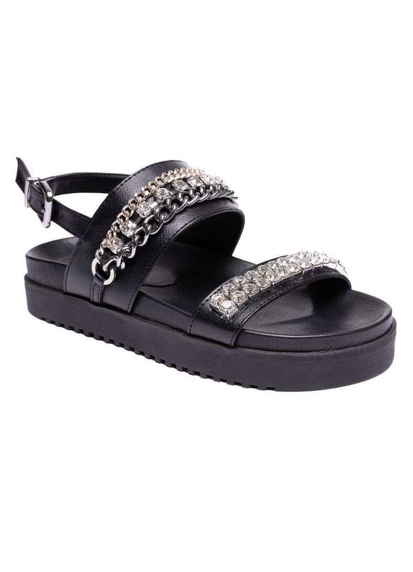 Via Miss - Papete Feminina Sandalia Fivela Flatform Corrente Cristal Preto