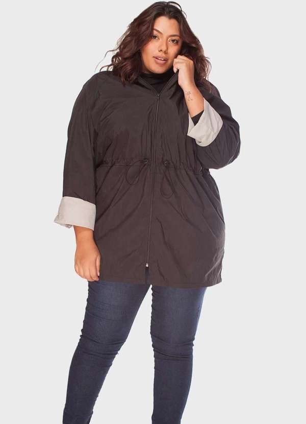 Parka corta-vento plus size. Feita em tecido tecnológico corta-vento. Modelagem alongada com fechamento em zíper. Ajuste em elástico na cintura. Capuz com ajuste em elástico para maior proteção. Forro do capuz e punho em cor contrastante. Bolsos faca nas laterais. Medidas: G equivale a 46-50 GG equivale 50-54 EXG equivale 54-58 Busto 132cm 138cm 144cm Cintura 132cm 138cm 144cm Quadril 136cm 142cm 146cm Comprimento 88cm 90cm 92cm Largura da manga 54cm 58cm 62cm