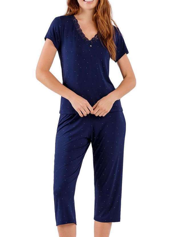 Características: Pijama feminino curto Blusa manga curta Gola em V e detalhe de renda aplicada no decote Calça modelo capri com cintura em elástico macio Confeccionado em malha visco comfy Modelo com estampa rotativa de poá Composição: 96% Viscose,04% Elastano