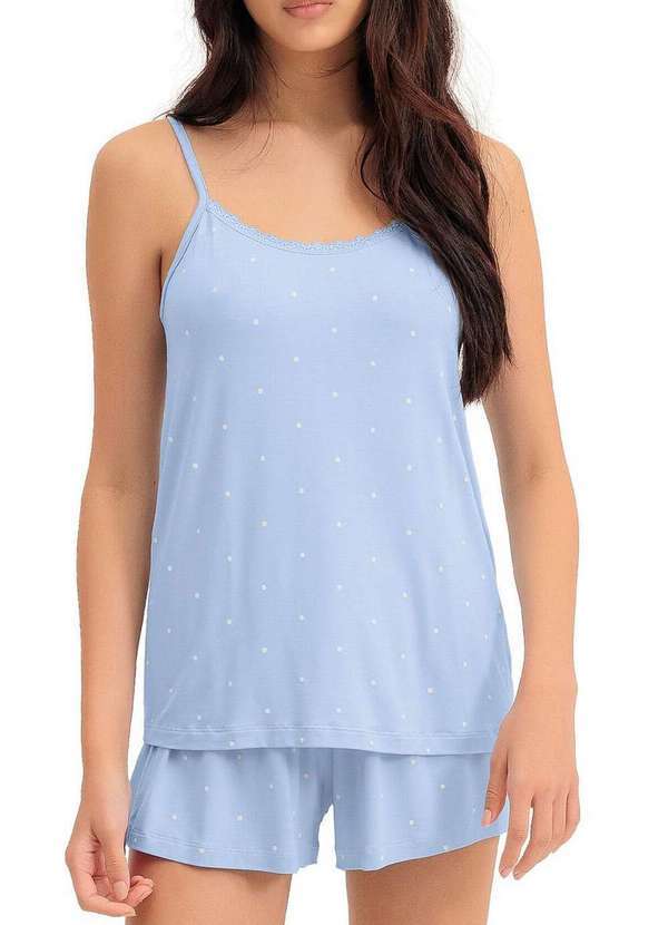 Características: Pijama Feminino Curto Delicado e super confortável, esse pijama é a escola perfeita para quem ama dormir com charme e leveza Confeccionado em malha visco comfy, oferece um toque suave na pele, com caimento fluido e agradável para as noites mais relaxantes A blusa tem fundo azul claro com estampa rotativa de mini poás em off white, trazendo um ar retrô e romântico à peça O decote é finalizado com uma renda estreita no mesmo tom da malha, que acrescenta feminilidade e elegância ao visual Ideal para quem busca conforto absoluto sem abrir mão da beleza nos detalhes Composição: 96% Viscose e 04% Elastano