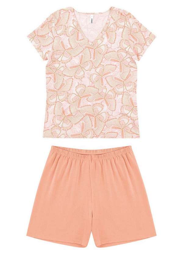 Características: Pijama feminino curto em malha essence Blusa manga curta Decote em V e estampa rotativa Shorts liso com cintura em elástico macio e modelagem meia coxa Atende tamanho plus size Composição: 96% Viscose, 04% Elastano