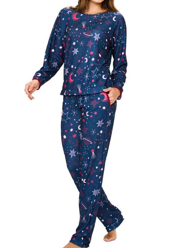 Características: Pijama Feminino Longo Manga longa e decote redondo Confeccionado em moletinho sublime touch Tecido com toque macio e confortável Feito em uma estampa digital com fundo escuro Possui detalhes em vinho na gola, nos punhos e na boca da calça Pijama ideal para ficar em casa confortável Composição: 97% Poliéster e 3% Elastano