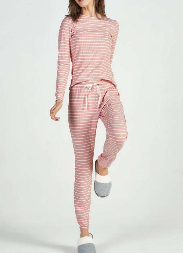 Características: Pijama Feminino Longo. Confeccionado em fio tinto de ribana canelada de viscolycra. Blusa possui mangas longas e gola redonda. Os acabamentos são em punho levemente ajustado. Calça com cintura em elástico 2 cm e falso amarrador personalizado. Modelagem afunilada. Composição: Blusa/Calça: 72% Viscose, 24% Poliéster e 04% Elastano.