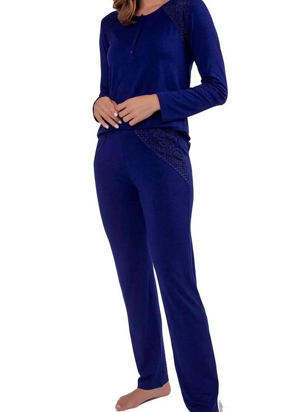 Características: Pijama feminino. Blusa manga longa. Gola careca que possui abertura funcional de botões. Renda larga na cor da peça aplicada na altura dos ombros. Calça cós elástico detalhes em renda larga na cor da peça aplicada no quadril. Confeccionado em viscolycra confort, tecido que proporcionando um toque macio e ótimo caimento. Composição: 96% Viscose e 08% Elastano.